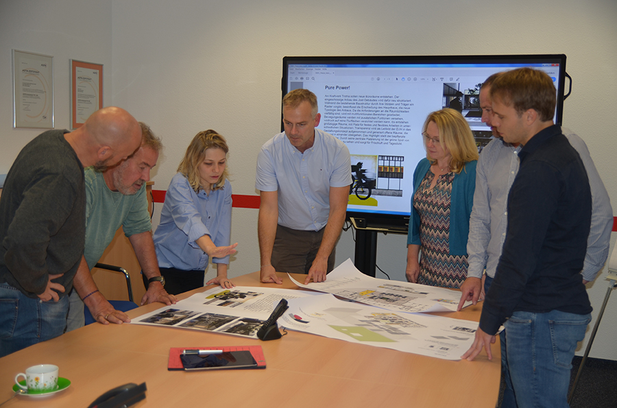 Gemeinsam besprechen Vertreter der Energieversorgung Halle Netz GmbH und der SWH-Projektgrupe und die Designerin heute, inwiefern der Entwurf am Standort Technischer Betriebshof umgesetzt werden kann und wie die sich die weitere Zusammenarbeit gestaltet. In der weiteren Vorgehensweise sollen auch einzelne Elemente der anderen Entwürfe sowie die besonderen Gegebenheiten des Bestandshauses berücksichtigt werden.